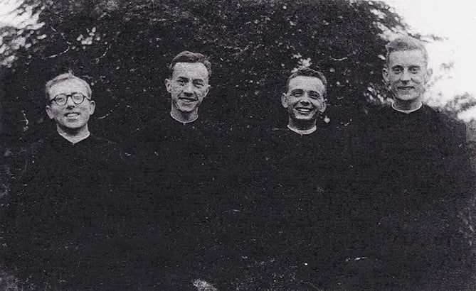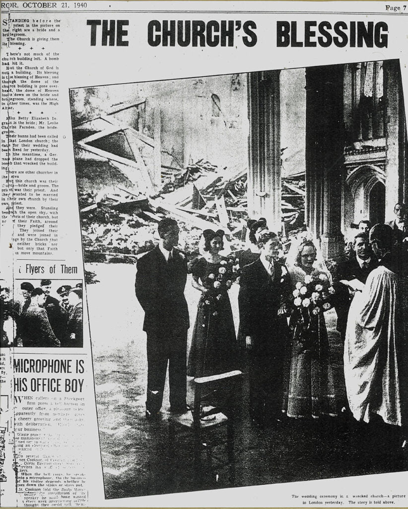 The Second World War created some disruption. Four monks volunteered as army chaplains and one of them, Dom Gervase Hobson-Matthews was killed when he chose to remain behind with the troops at Dunkirk. A few months later, a bomb destroyed a large part of the church. This, however, was not enough to prevent the marriage of Betty Ingram and Charles Farnden, who were determined to be married in their church by their priest. The Daily Mirror report of 21st October 1940 described the wedding as taking place in a church n London; it is not named to prevent the enemy finding out where their bombs had landed.