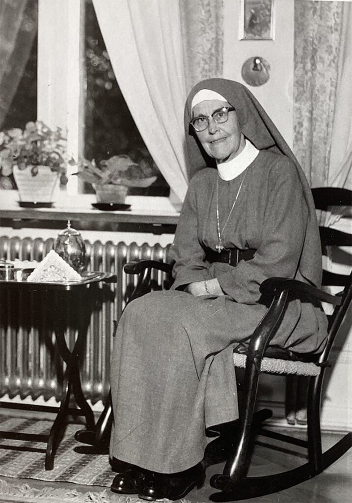 When Mother Magdalene could no longer take the lead – the onset of dementia was becoming apparent – she asked nearby Catholic Dominican sisters for advice. Their prioress, M Ingrid, was of Swedish descent and understood the sisters’ situation well. Her advice was that they should elect the novice, Sister Tyra, as prioress. The small community listened to the advice and in 1964 Sr Tyra was chosen as their new mother. After a period of probation, she was installed as Prioress of the community on 25 March 1965.